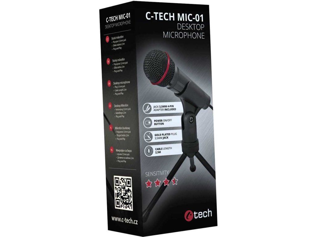C-TECH MIC-01 je vysokokvalitný mikrofón s prirodzenou kvalitou reprodukcie hlasu na každodenné použitie. Je vhodný na používanie s komunikačnými programami, ako aj na vytváranie videí na YouTube alebo živých prenosov. Mikrofón sa pripája pomocou 2,5 m kábla s pozláteným 3,5 mm stereo jack konektorom, ale súčasťou balenia je aj stereo redukcia 3-pin/4-pin jack na pripojenie mikrofónu k zariadeniu, ktoré má kombinovaný zvukový konektor pre mikrofón a slúchadlá. Mikrofón je vybavený tlačidlom ON/OFF. V balení nájdete praktický statív, vďaka ktorému môžete mikrofón umiestniť do rôznych polôh.