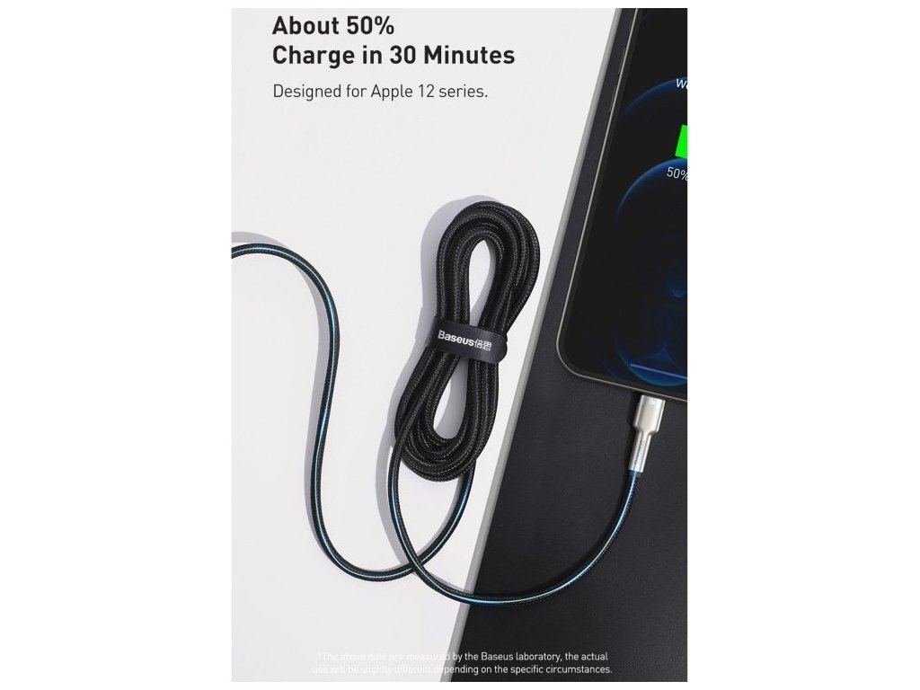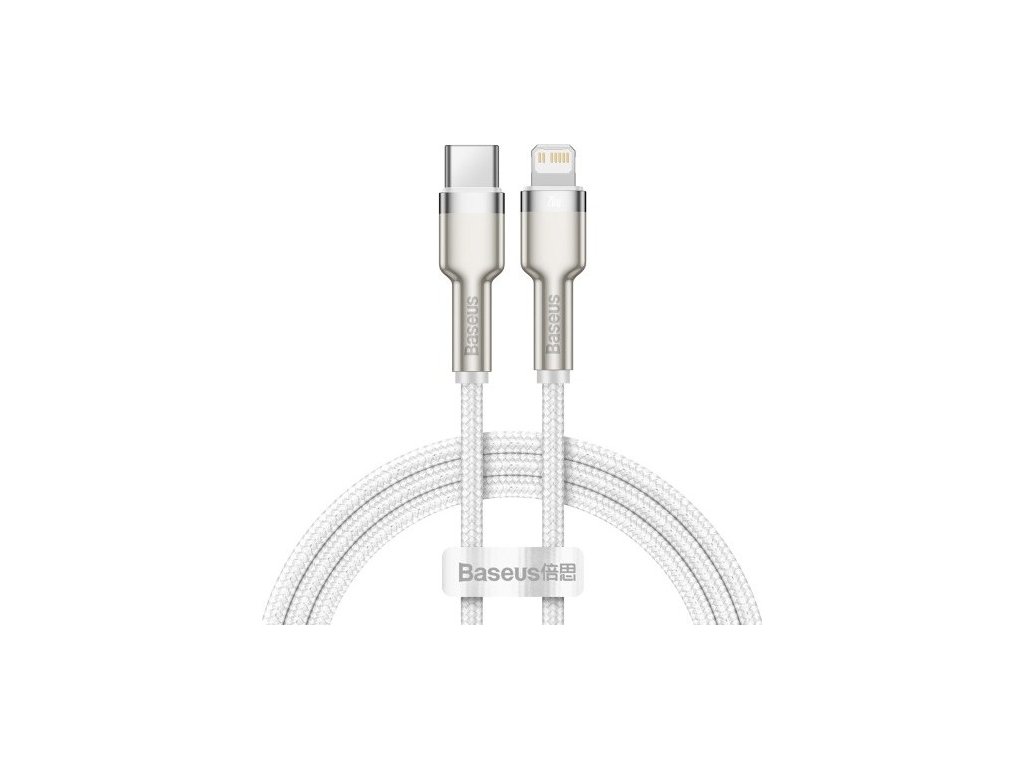 Kábel BASEUS Cafule Metal Series je odolný kábel, ktorého koncovky sú potiahnuté zliatinou zinku, aby vydržali dlhé a náročné používanie. Výrobok je tiež vybavený špeciálnym nylonovým opletením, ktoré zabraňuje treniu a chráni káble vo vnútri. Zlepšila sa aj odolnosť konektorov - boli testované na 10 000 spojení a boli špeciálne profilované tak, aby sa kábel dal používať aj vtedy, keď je telefón v puzdre. Kábel má funkciu rýchleho nabíjania a prenosu dát PD 20 W. Jeho dĺžka je 100 cm.