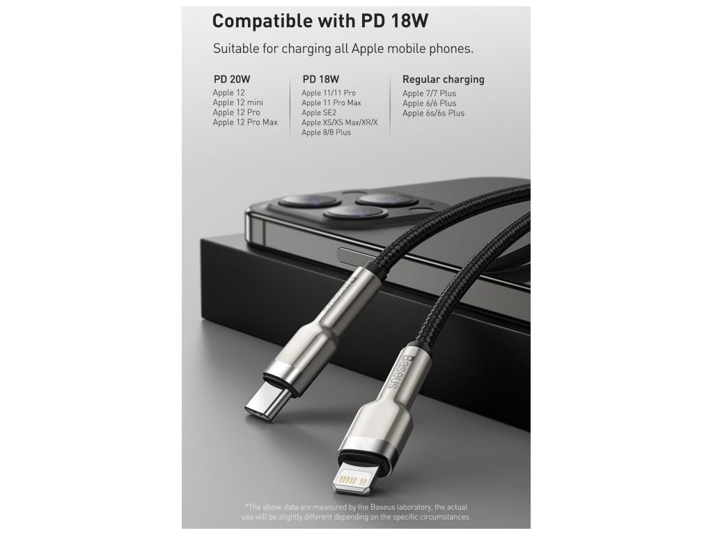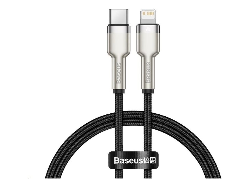 Kábel BASEUS Cafule Metal Series je odolný kábel, ktorého koncovky sú potiahnuté zliatinou zinku, aby vydržali dlhé a náročné používanie. Výrobok je tiež vybavený špeciálnym nylonovým opletením, ktoré zabraňuje treniu a chráni káble vo vnútri. Zlepšila sa aj odolnosť konektorov - boli testované na 10 000 spojení a boli špeciálne profilované tak, aby sa kábel dal používať aj vtedy, keď je telefón v puzdre. Kábel má funkciu rýchleho nabíjania a prenosu dát PD 20 W. Jeho dĺžka je 200 cm.