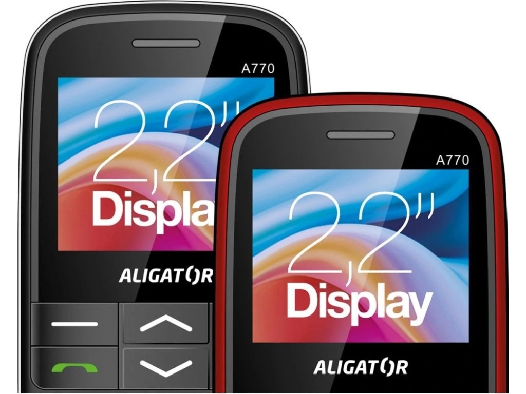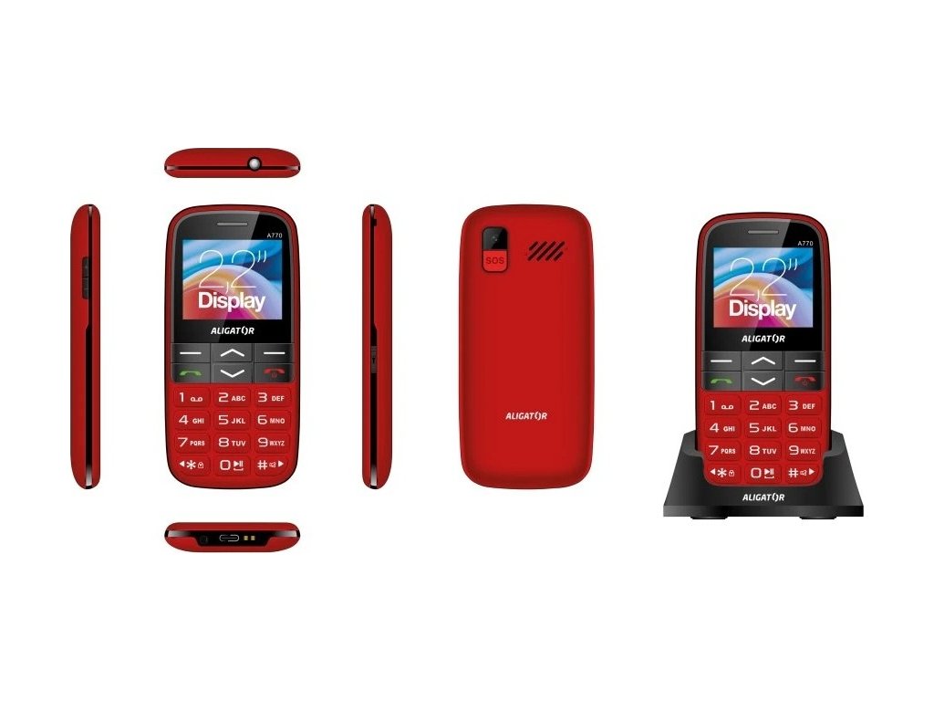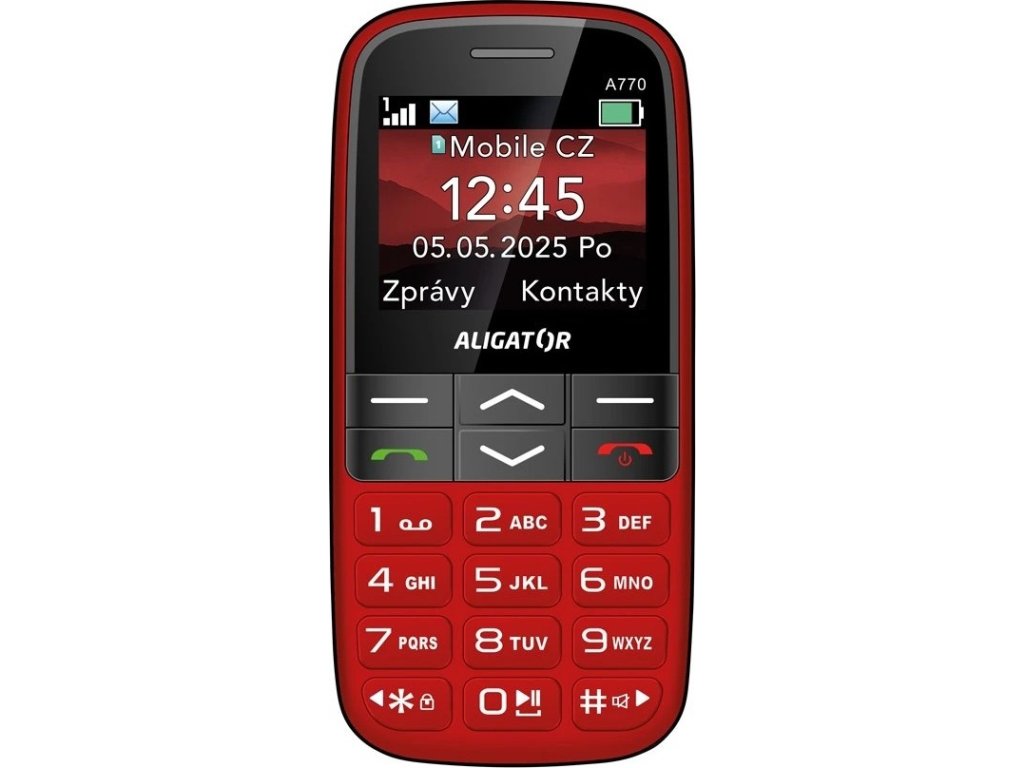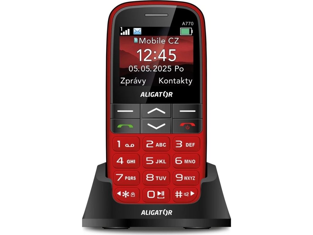 Obsah balení: Telefon Aligator A770, nabíjecí stojánek, návod k použití (bez nabíječky)