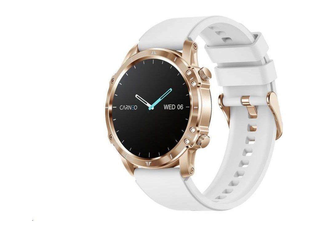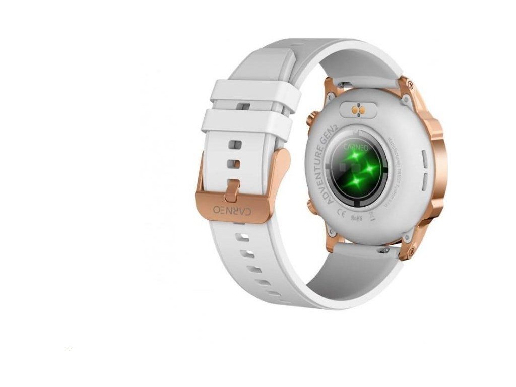 Moderné outdoorové fitness hodinky CARNEO ADVENTURE HR+ druhej generácie v zlatoružovej farbe s bielym, na dotyk veľmi príjemným silikonovým remienkom a farebným SUPER AMOLED displejom s vysokým jasom a funkciou trvalého zobrazenia času monitorujú vašu dennú aktivitu, úroveň stresu, ale je možné ich spárovať s mobilným telefónom a upozorniť vás na prichádzajúci hovor alebo SMS. Hodinky umožňujú telefonovať, aniž by ste museli vybrať telefón z tašky, vďaka vstavanému mikrofónu a reproduktoru až do vzdialenosti 10 m od telefónu. Ich bezchybné kovové telo s nadčasovými outdoorovými krivkami je tak návykové, že ich po prvom nosení nebudete chcieť sundávať zo zápästia. Extrémne odolné sklo Gorilla glass ochráni ich krištáľovo čistý displej pred poškriabaním.