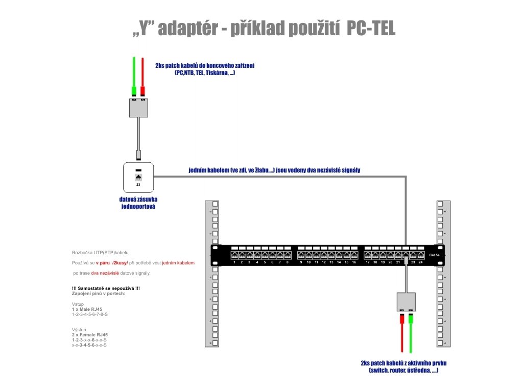 Stíněná rozbočka STP(také UTP) kabelu. Foto ilustrační (balení obsahuje 1ks) Používá se v páru při potřebě vést jedním kabelem datový signál + signál telefonní. Pro správnou funkčnost nutno zakoupit sudý počet Zapojení pinů: 1 x Male RJ45 1-2-3-4-5-6-7-8 2 x Female RJ45 1-2-3-x-x-6-x-xx-x-3-4-5-6-x-x