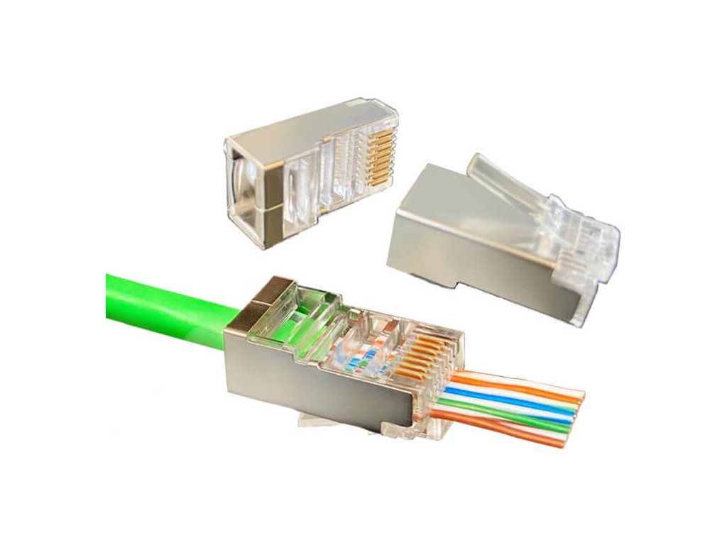 RJ45 konektor STP RJ-45EZ, Cat5 pozlacený, krimpovací, licna i drát, konektor RJ 45 průchozí pass through utp, koncovka na síťový kabel, 100ks, 8P8C 8 pozic 8 kontaktů