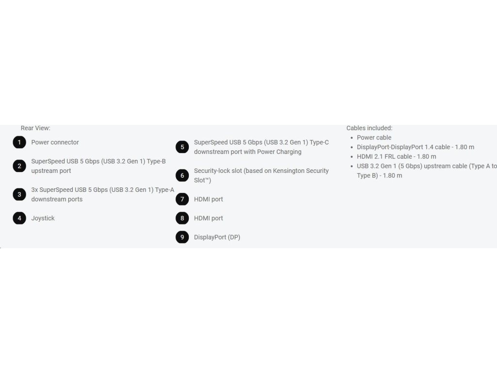 | Napájací kábla ? DisplayPort-DisplayPort 1.4 kábel - 1.80 m ? HDMI 2.1 FRL kábel - 1.80 m ? USB 3.2 Gen 1 (5 Gbps) vstupný kábel (Type A na Type B) - 1.80 m |