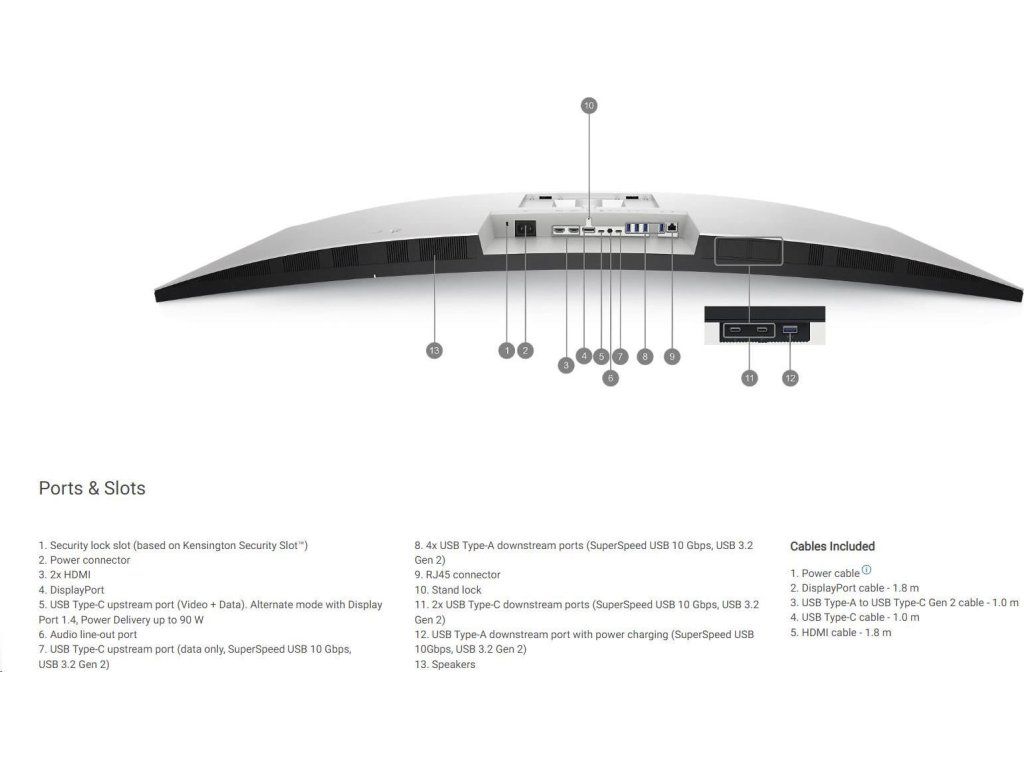 1. Security lock slot (based on Kensington Security Slot™) 2. Power connector 3. 2x HDMI 4. DisplayPort 5. USB Type-C upstream port (Video + Data). Alternate mode with Display Port 1.4, Power Delivery up to 90 W 6. Audio line-out port 7. USB Type-C upstream port (data only, SuperSpeed USB 10 Gbps, USB 3.2 Gen 2) 8. 4x USB Type-A downstream ports (SuperSpeed USB 10 Gbps, USB 3.2 Gen 2) 9. RJ45 connector 10. Stand lock 11. 2x USB Type-C downstream ports (SuperSpeed USB 10 Gbps, USB 3.2 Gen 2) 12. USB Type-A downstream port with power charging (SuperSpeed USB 10Gbps, USB 3.2 Gen 2) 13. Speakers |