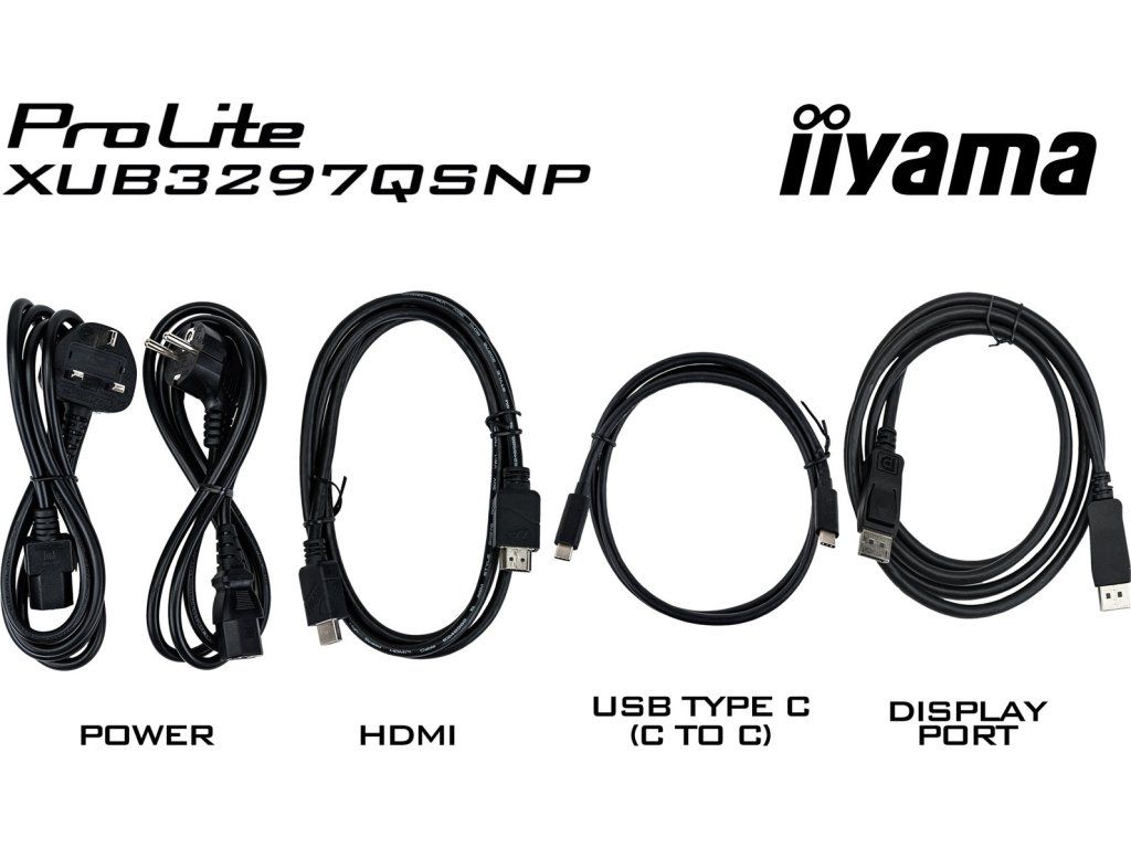 Obsah balení: napájecí kabel, HDMI kabel, DP kabel, USB-C kabel, uživatelský manuál, instrukce bezpečnosti