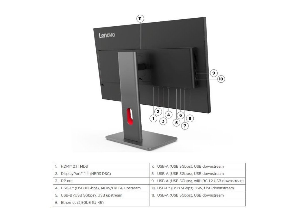 | USB port | 1x USB-C (USB 10Gbps,DP 1.4 Alt Mode HBR3, PD3.1 140W, USB upstream), 1x USB-B (USB 5Gbps, USB upstream), 3x USB-A (USB 5Gbps, USB downstream), 1x USB-A (USB 5Gbps, s BC1.2, USB downstream), 1x USB-C (USB 5Gbps, 15WPD, USB downstream) |