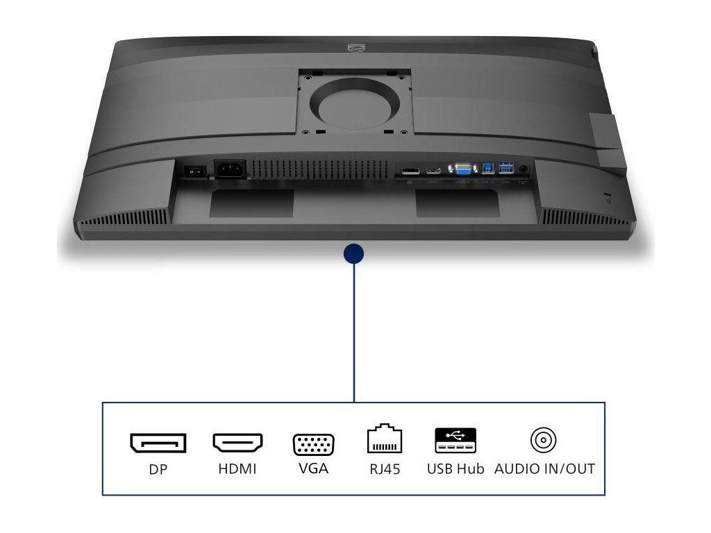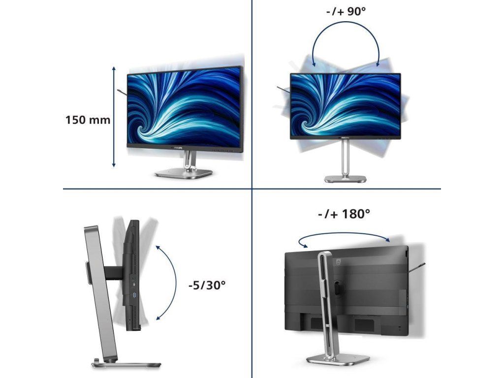 Rozlíšenie:1920×1080 (Full HD); Výbava:Reproduktory, VESA, Pivot, Nastaviteľná výška, Redukce blikání (flicker-free), Redukce modrého světla, USB nabíjení; Formát obrazovky:16:9; Povrchová úprava displeja:Antireflexní; Energetická trieda:C; Rozhranie:USB 3.2 Gen 1, HDMI, VGA, DisplayPort, USB Type-C