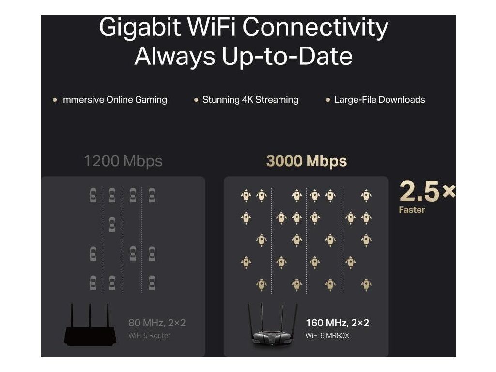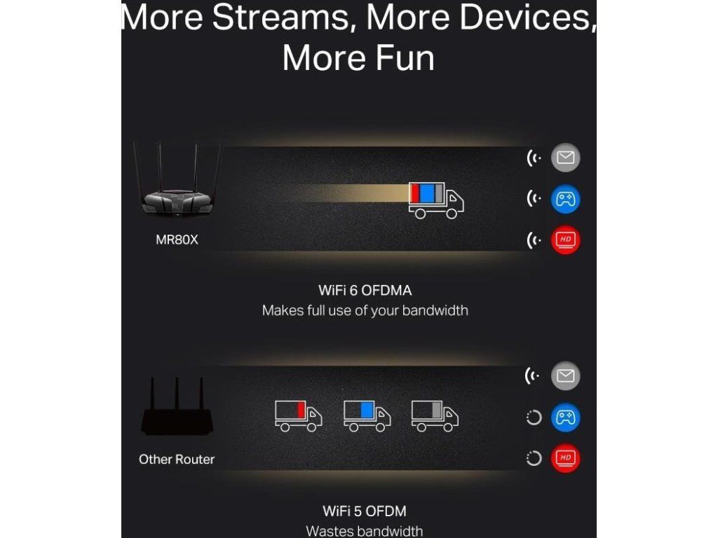 - Viac zariadení, viac zábavy – podporuje technológie MU-MIMO a OFDMA, ktoré znižujú zahltenie siete a štvornásobne zvyšujú priemernú priechodnosť.