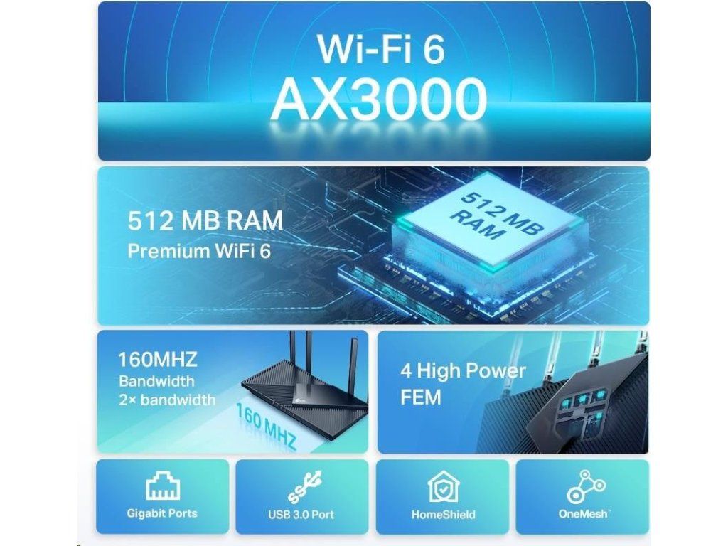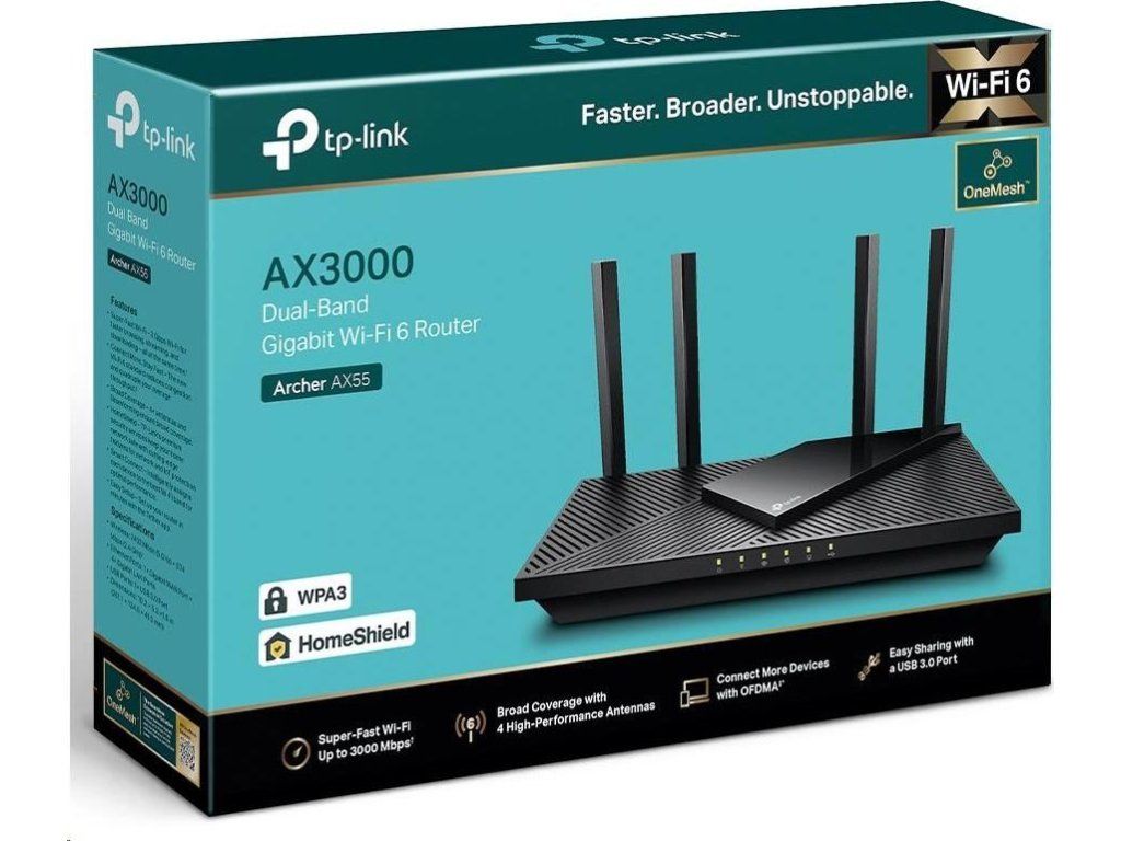 TP-Link Archer AX55 OneMesh/EasyMesh WiFi6 router (AX3000, 2,4GHz/5GHz, 4xGbELAN, 1xGbEWAN, 1xUSB3.0)