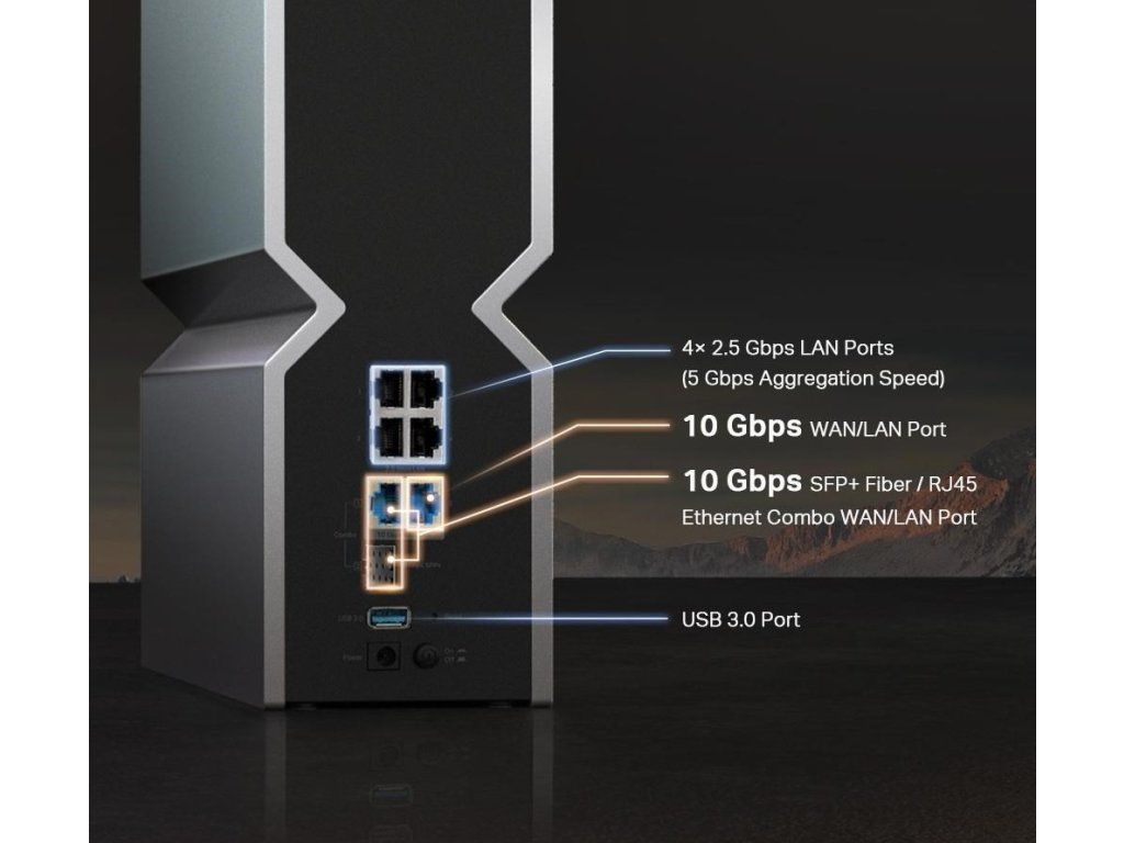 - Dva 10G porty: 1× 10 Gb/s kombinovaný ethernetový/optický port WAN/LAN + 1× 10 Gb/s WAN/LAN port + 4× 2.5 Gb/s porty + 1× USB 3.0 port zaisťujú maximálnu flexibilitu a zvýšenú prepustnosť.§