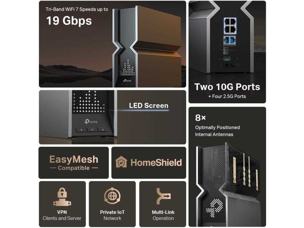 - Nový koncept Wi-Fi routerov: Výkonná technológia Wi-Fi 7, bleskurýchle káblové pripojenie, úplne nový dizajn a LED displej.