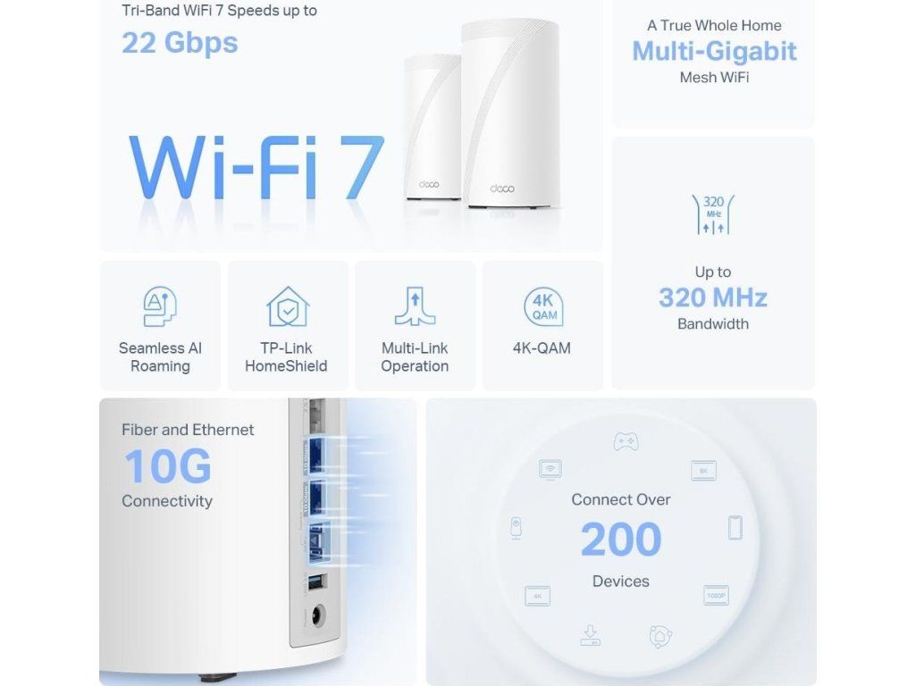 TP-Link Deco BE85(2-pack) WiFi7 Mesh(BE22000,2,4GHz/5GHz/6GHz,1x10GbELAN/WAN,1xSFP+/10GbELANcombo,2x2,5GbELAN/WAN,1xUSB)