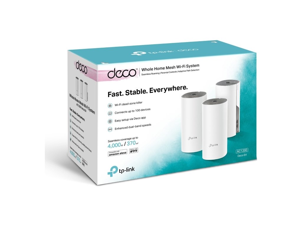- Deco E4 poskytuje rýchle a stabilné spojenie rýchlosťou až 867 Mb/s a spolupracuje s hlavnými poskytovateľmi internetových služieb (ISP) a modemom.