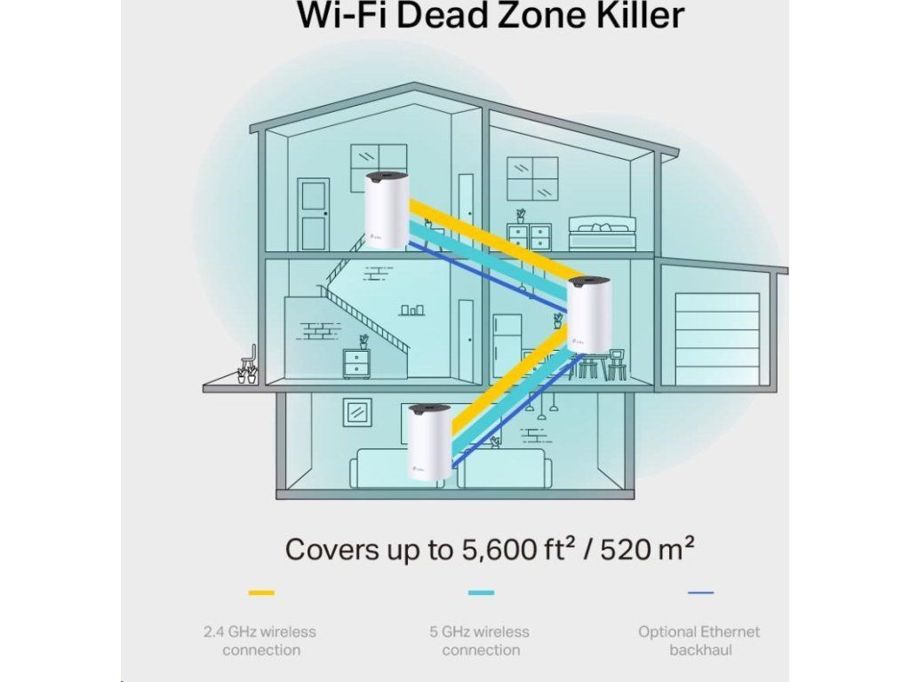 | WiFi Dosah | 3-5 izbové domy (3-pack) TP-Link Mesh technológia Voliteľný Ethernet backhaul spolupracuje, aby prepojil jednotky Deco a zabezpečil plynulé pokrytie 3× antény (vnútorné) Viaceré antény tvoria mriežku na zosilnenie signálu a pokrytie väčších oblastí Beamforming Sústreďuje bezdrôtový signál smerom ku klientom, čím rozširuje WiFi dosah |