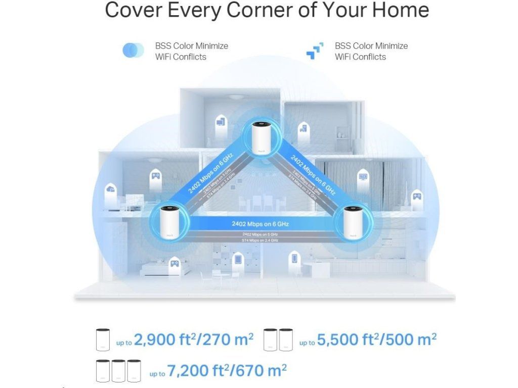 - Wi-Fi 6E pokrytie celej domácnosti – pokryte plochu až 670 m2 ničím nerušeným Wi-Fi signálom budúcej generácie a zabudnite na mŕtve zóny pokrytia a načítanie do vyrovnávacej pamäti