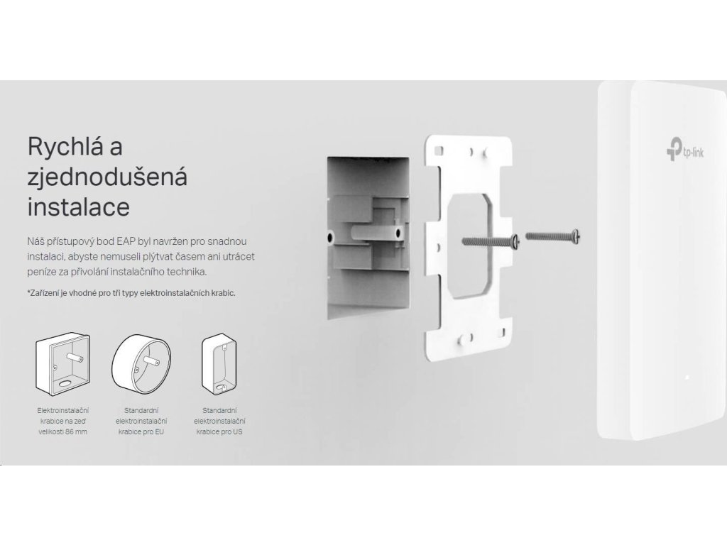 | Obsah balenia | • AX1800 Wall Plate WiFi 6 Access Point EAP615-Wall • Inštalačný návod • Montážne súpravy |