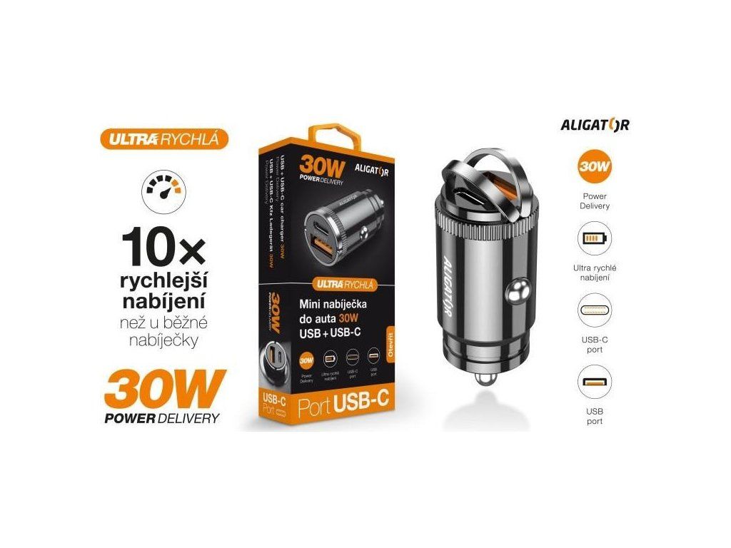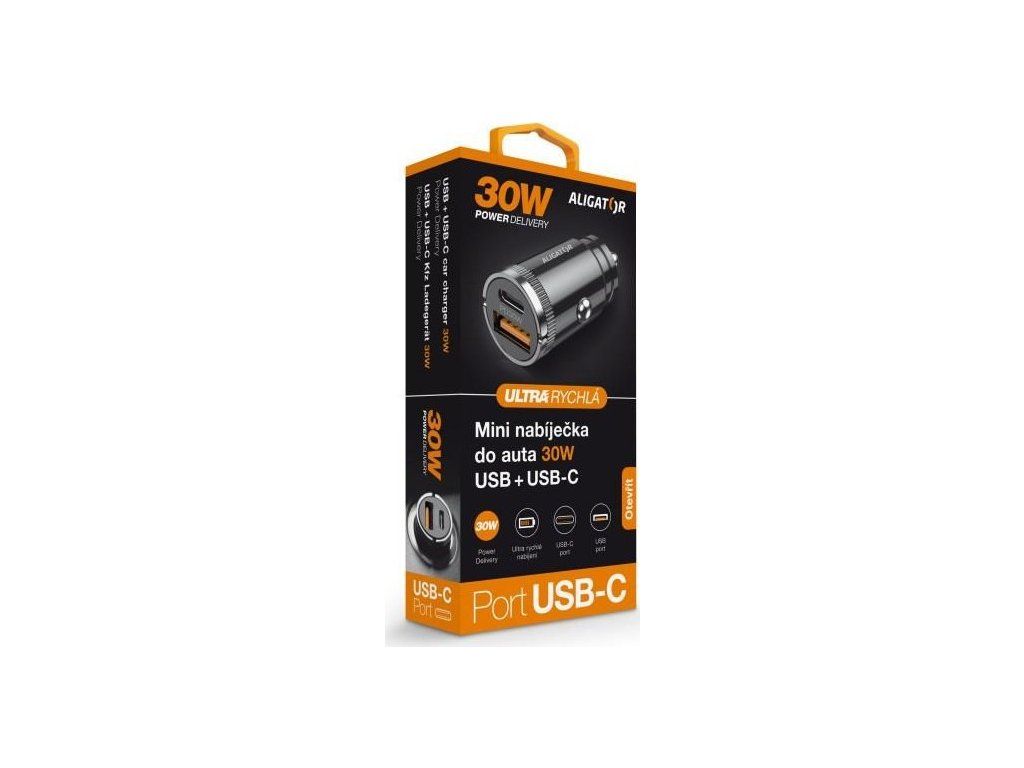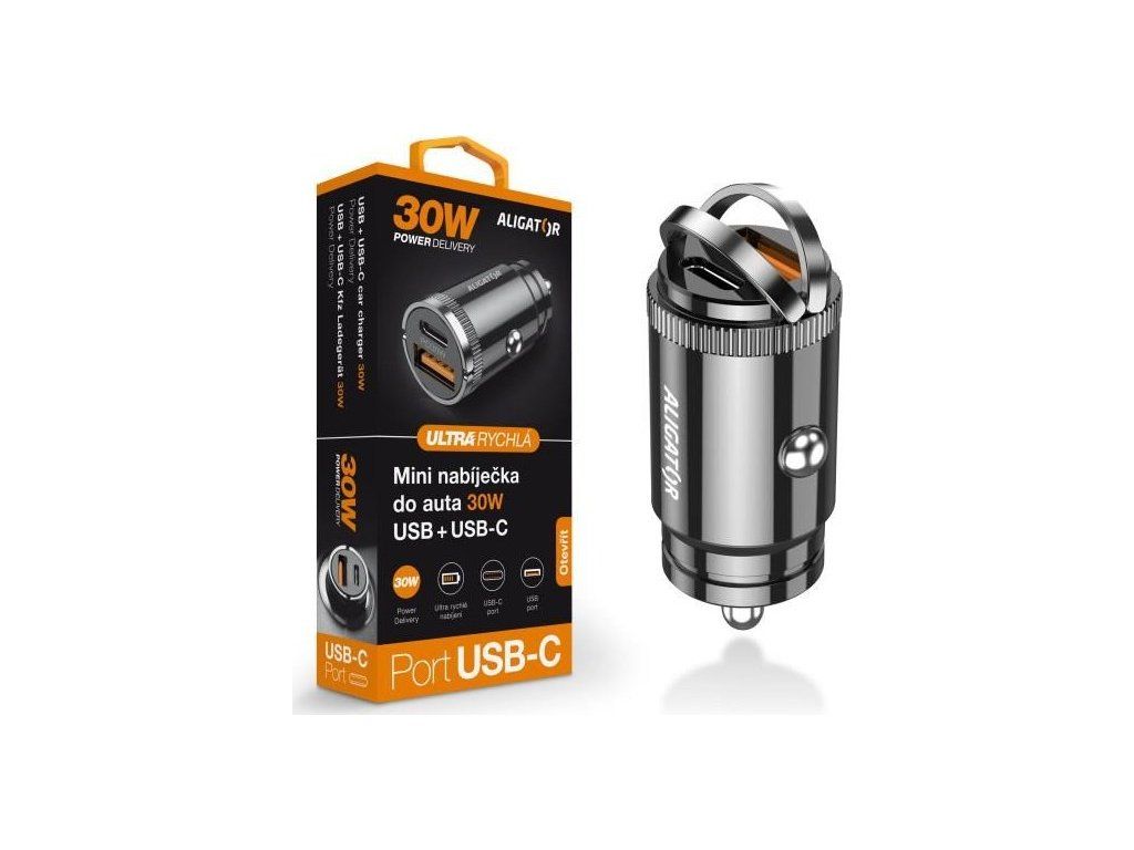 ALIGATOR chytrá mini nabíječka do auta Power Delivery 30W, USB-C + USB-A, černá