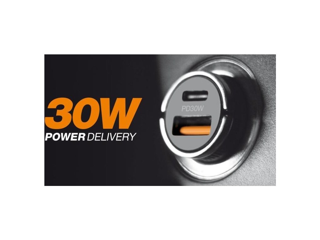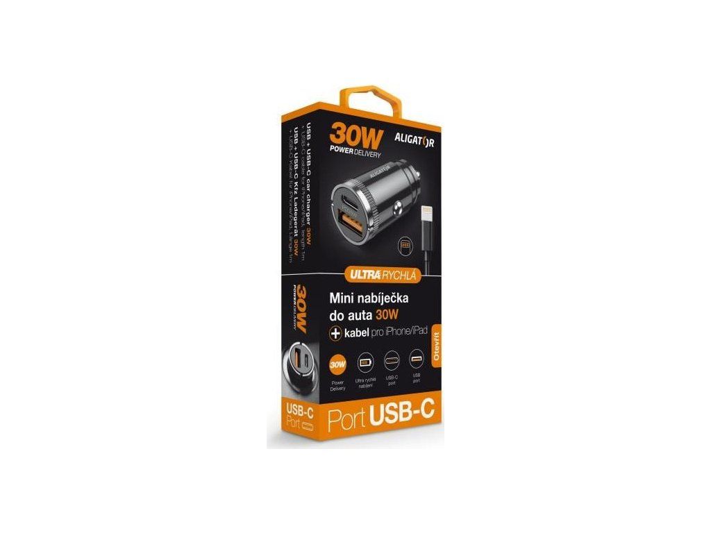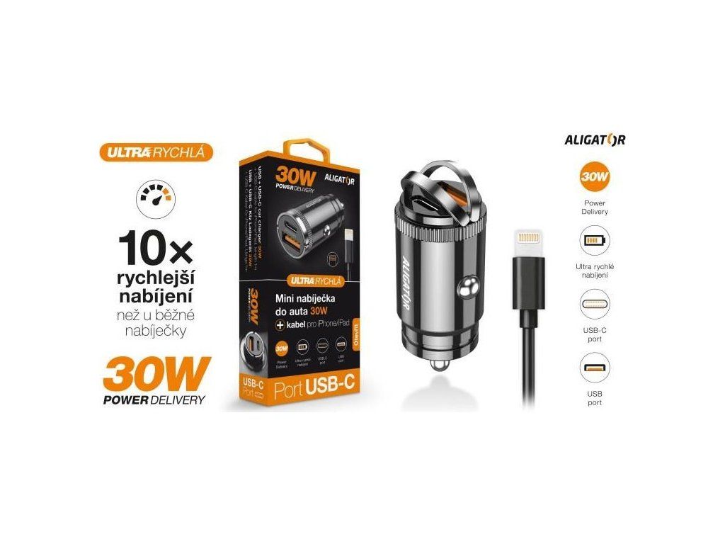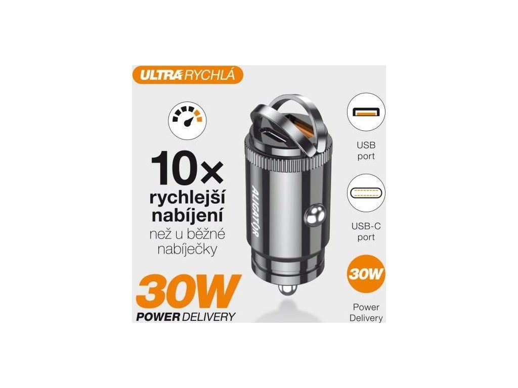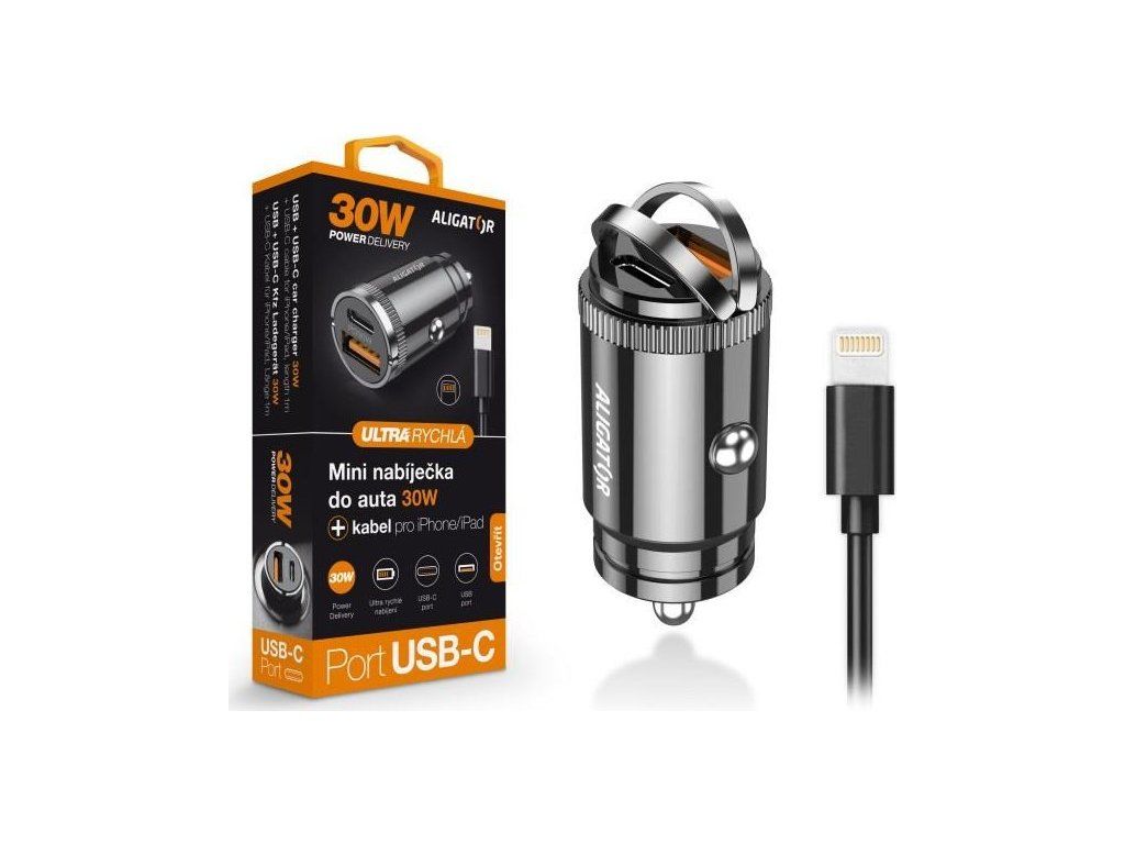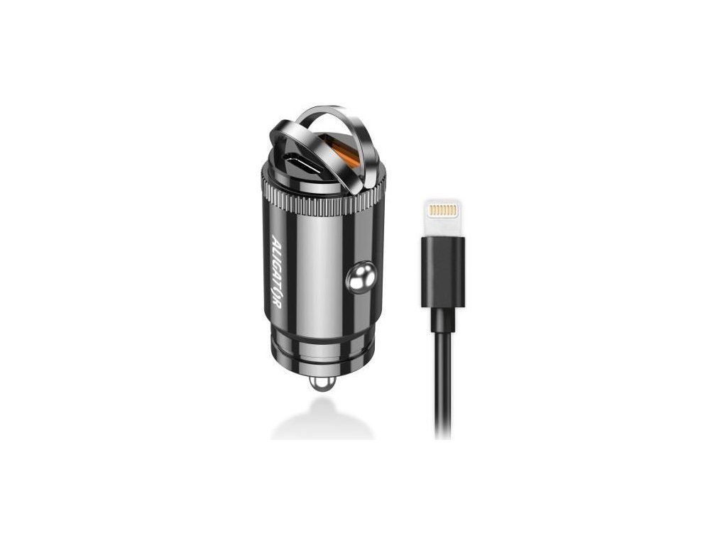 ALIGATOR chytrá mini nabíječka do auta Power Delivery 30W, USB-C + USB-A, kabel USB-C/Lightning, černá