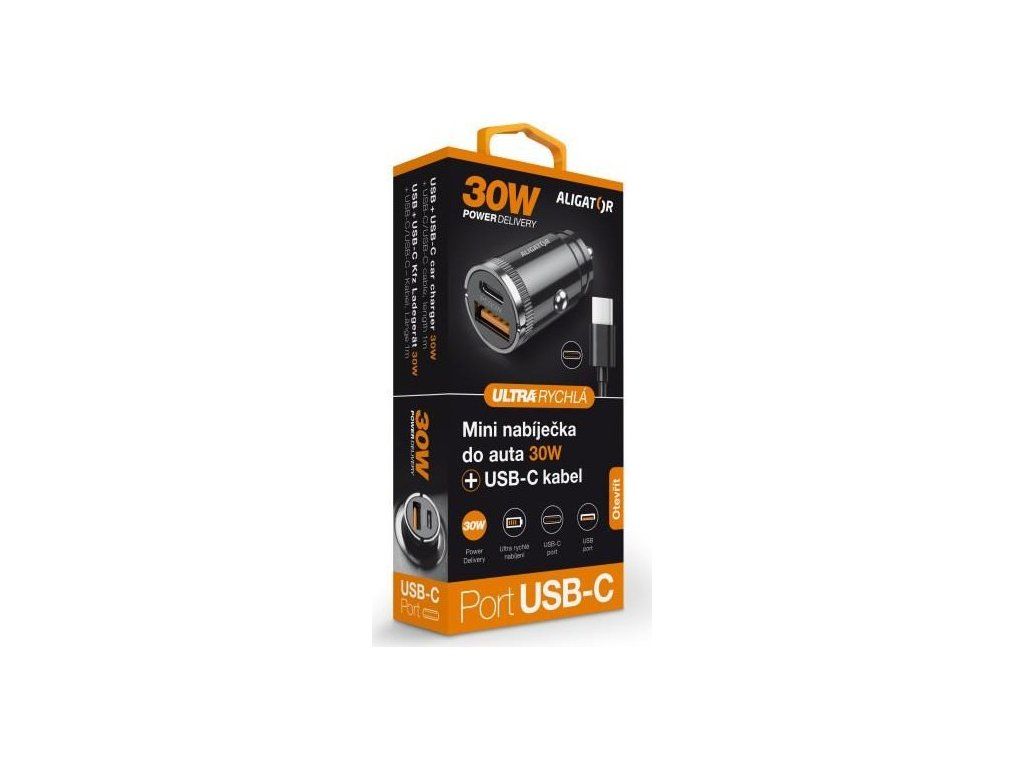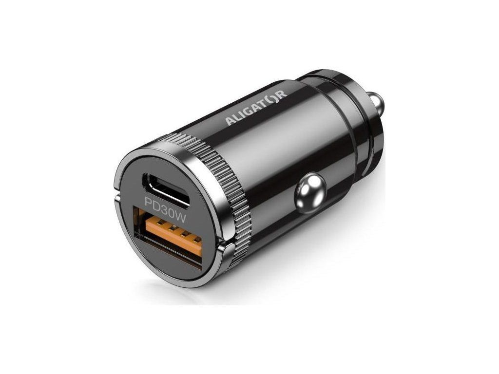 ALIGATOR chytrá mini nabíječka do auta Power Delivery 30W, USB-C + USB-A, kabel USB-C/USB-C, černá