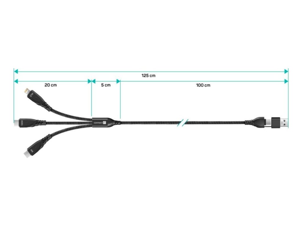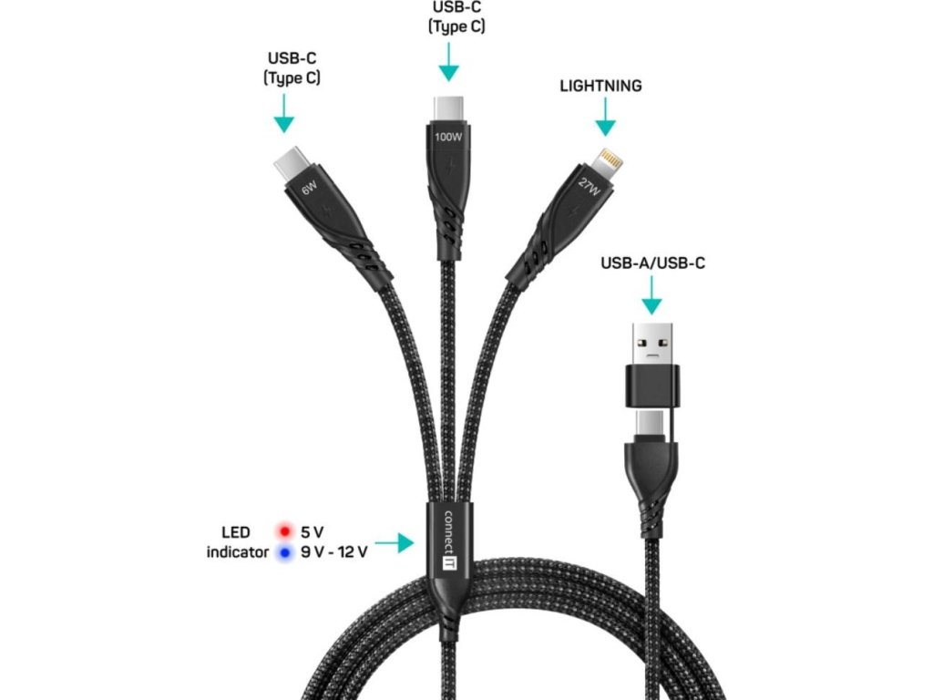 CONNECT IT Nabíjecí kabel Wirez 6v1, USB-C/USB, Lightning + 2x USB-C, 1.25m, černá