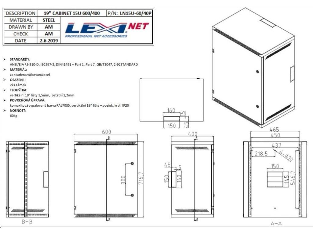 LEXI-Net rack 9U, plný plech, hĺbka 400 mm - ŠTANDARDY: ANSI/EIA RS-310-D, IEC297-2, DIN41491 - časť 1, časť 7, GB/T3047, 2-92STANDARD - MATERIÁL: oceľ valcovaná za studena - UPEVNENIE : 1ks zámok - PLECH: vertikálne 19" koľajnice 1,5 mm, ostatné 1,2 mm - povrchová úprava: komaxitová zapečená farba RAL7035, vertikálne 19" koľajnice - pozinkované - NOSNOSNOSŤ: 60 kg ROZMER: Š x V x H 600x455x400 mm.
