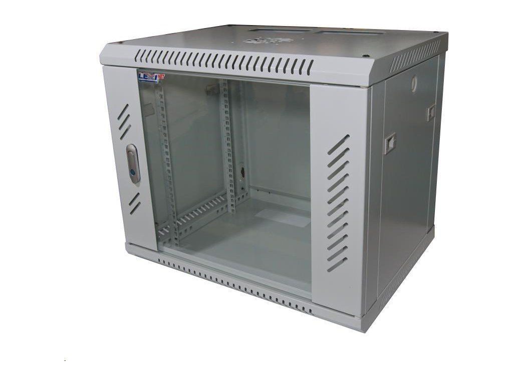 19" nástenný 9U rack LEXI, šírka 600 mm, hĺbka 450 mm, sklenené dvere, nosnosť 60 kg, dodávaný v rozloženom stave, sivá farba