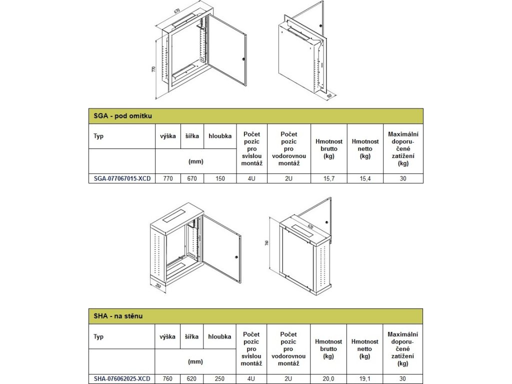 Hybridný rozvádzač SHA - IP20, nosnosť 30 kg. Rozvádzač je určený na zapustenú montáž (model SGA) JEDNODUCHÁ INŠTALÁCIA Horná polovica skrine je vybavená posuvnými držiakmi na montáž 19" patch panelov alebo vane s ističom. MONTÁŽ VODIČOV Na bočných stranách v dolnej polovici skrine sú držiaky pre 19" zariadenia. BREAK-outs v strope a na dne skrine sú pripravené káblové vstupy zakryté break-outs..