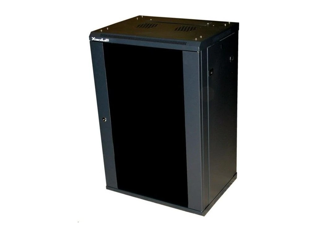 XtendLan 19" nástěnný rozvaděč 18U 600x450, nosnost 60 kg, skleněné kouřové dveře, rozložený, černý