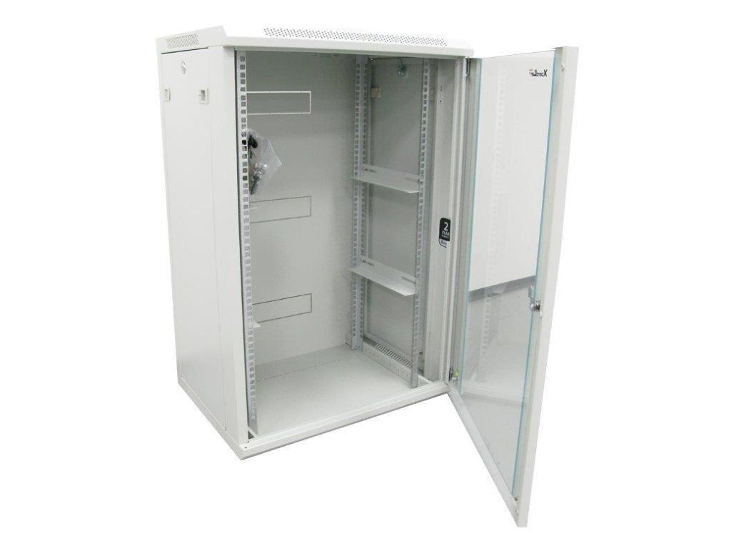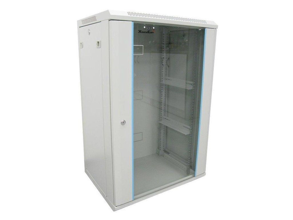 XtendLan 19" nástěnný rozvaděč 18U 600x600, nosnost 60 kg, skleněné kouřové dveře, rozložený, šedý