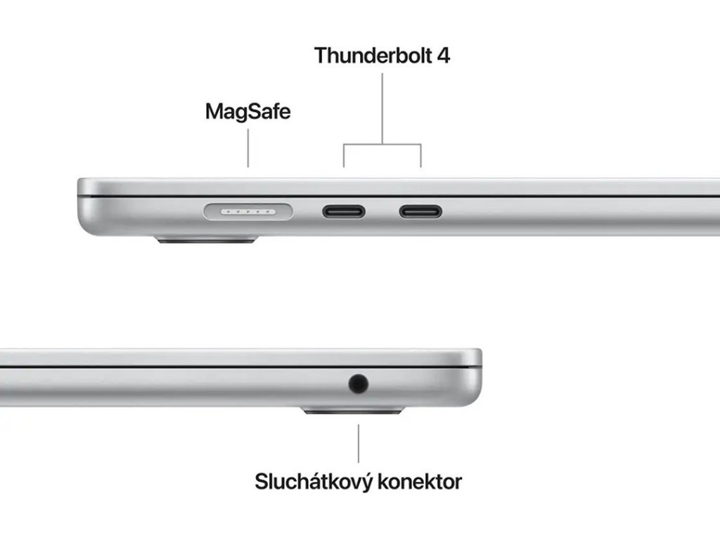 MagSafe nabíjací kábel sa pripája a drží pomocou magnetov. A keď naň omylom zakopneš, uvoľní sa, takže si počítač nespadne na zem. Dva porty Thunderbolt 4 sú vhodné na pripojenie vysokorýchlostných doplnkov a napájanie Macu. Sluchátkový konektor podporuje vysokoimpedančné slúchadlá. A Wi-Fi 6E má až dvojnásobnú priepustnosť v porovnaní s Wi-Fi 6. Pripoj si k MacBooku Air až dva externé monitory, aby si mal dokonalú pracovnú stanicu s veľkým priestorom, kde práca s viacerými dokumentmi alebo aplikáciami bude rýchla.