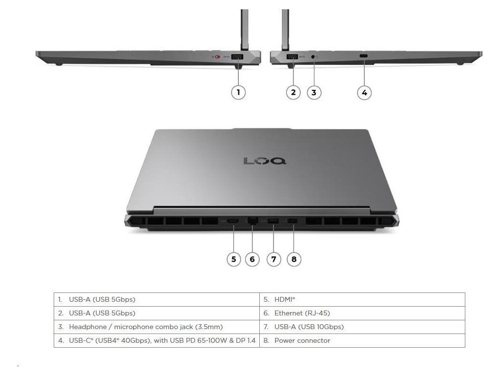 | Standartné porty | 2x USB-A (USB 5Gbps) 1x USB-A (USB 10Gbps) 1x USB-C (USB4 40Gbps), with USB PD 65-100W and DisplayPort™ 1.4 1x HDMI 2.1, up to 8K/60Hz 1x Headphone / microphone combo jack (3.5mm) 1x Ethernet (RJ-45) 1x Slim tip Power connector |