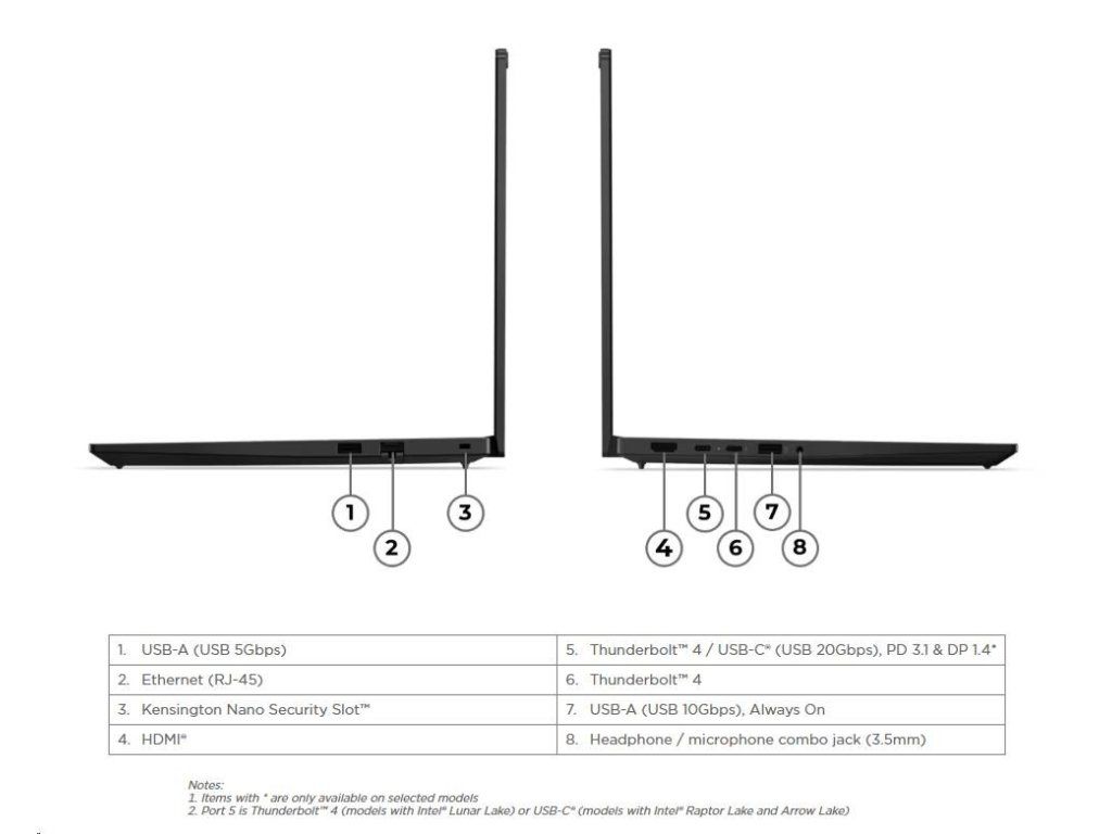 | Standartné porty | 1x USB-A (USB 5Gbps / USB 3.2 Gen 1) 1x USB-A (USB 10Gbps / USB 3.2 Gen 2), Always On 1x USB-C (Thunderbolt™ 4 / USB4 40Gbps), with USB PD 45-65W and DisplayPort™ 2.1 1x HDMI 2.1, up to 4K/60Hz 1x Headphone / microphone combo jack (3.5mm) 1x Ethernet (RJ-45) Optional Ports (configured) 1x USB-C (Thunderbolt™ 4 / USB4 40Gbps), with USB PD 45-65W and DisplayPort™ 2.1 |