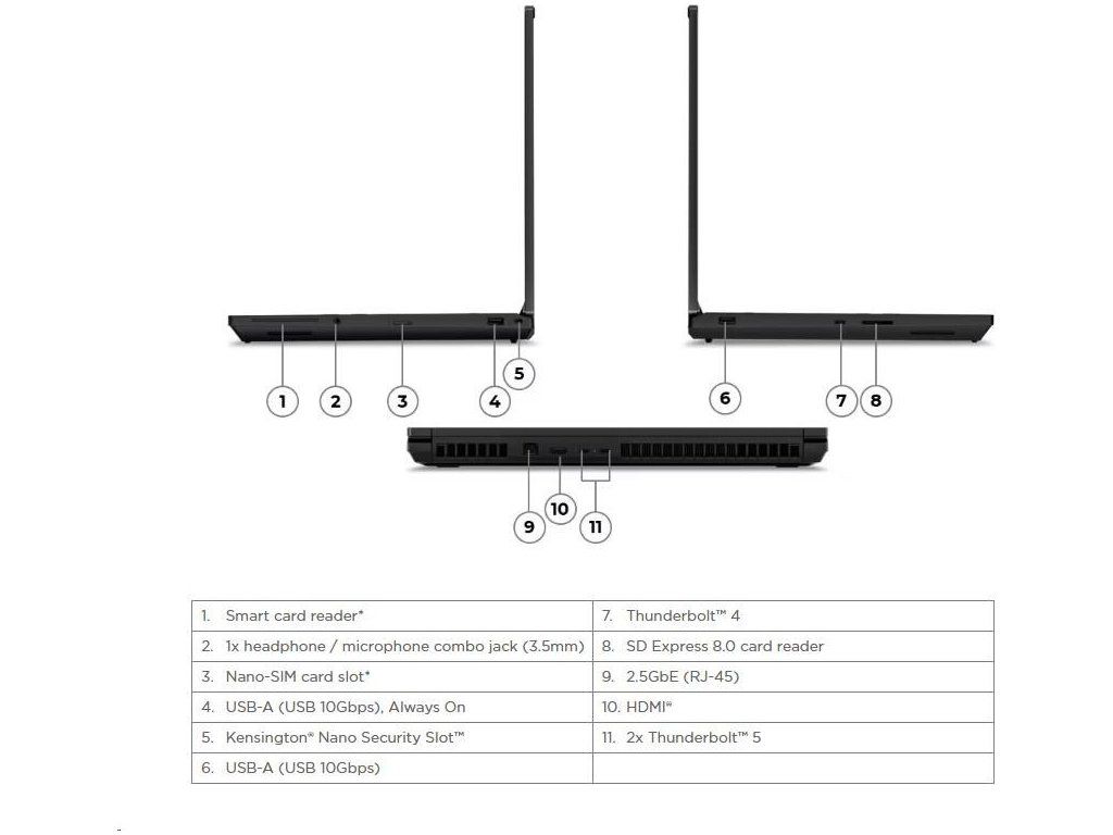| Standartné porty | 1x USB-A (USB 10Gbps / USB 3.2 Gen 2), Always On 1x USB-A (USB 10Gbps / USB 3.2 Gen 2) 2x Thunderbolt™ 5, with DisplayPort™ 2.1 and USB PD 3.1, 180W input / 15W output 1x Thunderbolt™ 4, with DisplayPort™ 2.1 and USB PD 3.1, 180W input / 15W output 1x HDMI 2.1, up to 8K/60Hz 1x Headphone / microphone combo jack (3.5mm) 1x Ethernet (2.5GbE RJ-45) 1x SD Express 8.0 card reader |