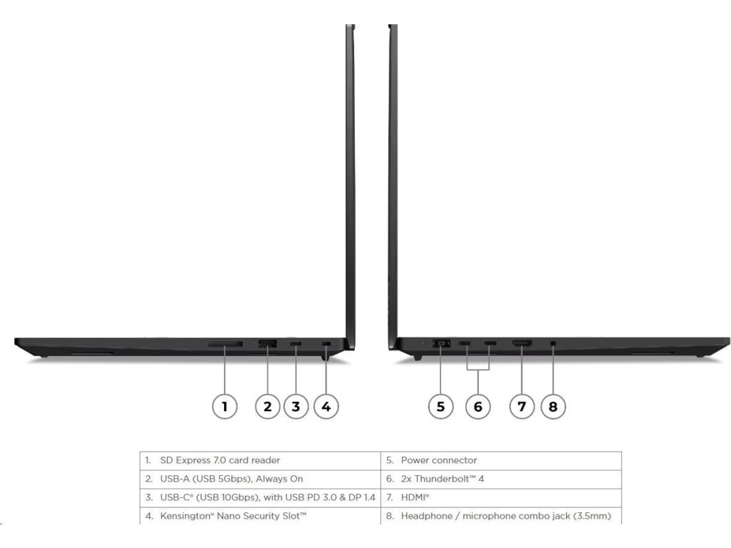 | Štandardné porty | 1x USB-A (USB 5Gbps / USB 3.2 Gen 1), stále napájané 1x USB-C (USB 10Gbps / USB 3.2 Gen 2), s PD 3.0 (135W vstup) a DisplayPort 1.4 2x USB-C (Thunderbolt 4 / USB4 40Gbps), s PD 3.0 (135W vstup) a DisplayPort 2.1 1x HDMI 2.1, až 8K/60Hz 1x slúchadlový/mikrofónový jack (3.5mm) 1x SD Express 7.0 čítačka kariet 1x bezpečnostná dierka |
