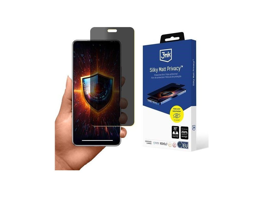 Fólia na ochranu súkromia 3mk Silky Matt Privacy™ je určená pre používateľov inteligentných telefónov, ktorí chcú mať súkromie a pohodlie pri používaní telefónu na verejných miestach. Vďaka použitiu filtra na ochranu súkromia je obsah zobrazený na displeji účinne chránený pred zvedavými pohľadmi okoloidúcich. Obrázok je rozmazaný a zatienený pod uhlom 30°. Nikoho z okoloidúcich neuvidí, čo práve robíte na svojom smartfóne. Dôverné informácie si ponecháte pre seba.