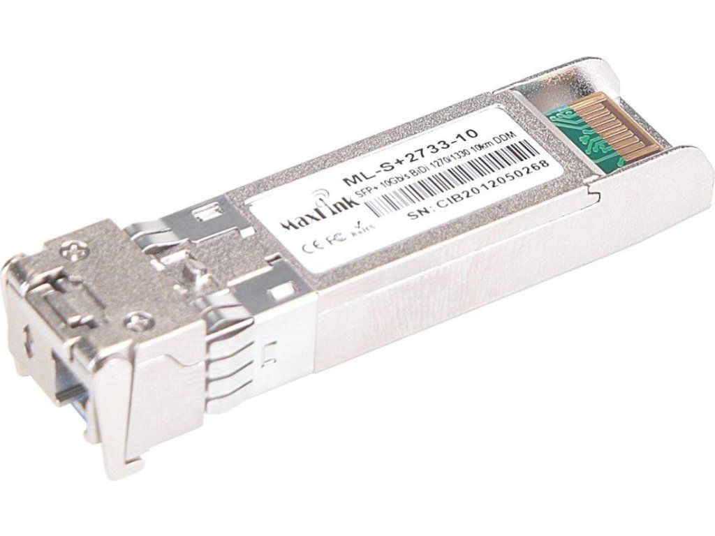 ML-S+2733-10 je singlemode 10G SFP+ WDM modul pro přenos dat pomocí jednoho vlákna s jedním LC konektorem. Vlnová délka (Tx/Rx) tohoto modulu je 1270/1330nm a je vhodný pro spojení až na vzdálenost 10km. Modul je "cisco compatibile" a je kompatibilní téměř se všemi aktivními prvky. LC konektory v SFP modulu mají broušení typu UPC.