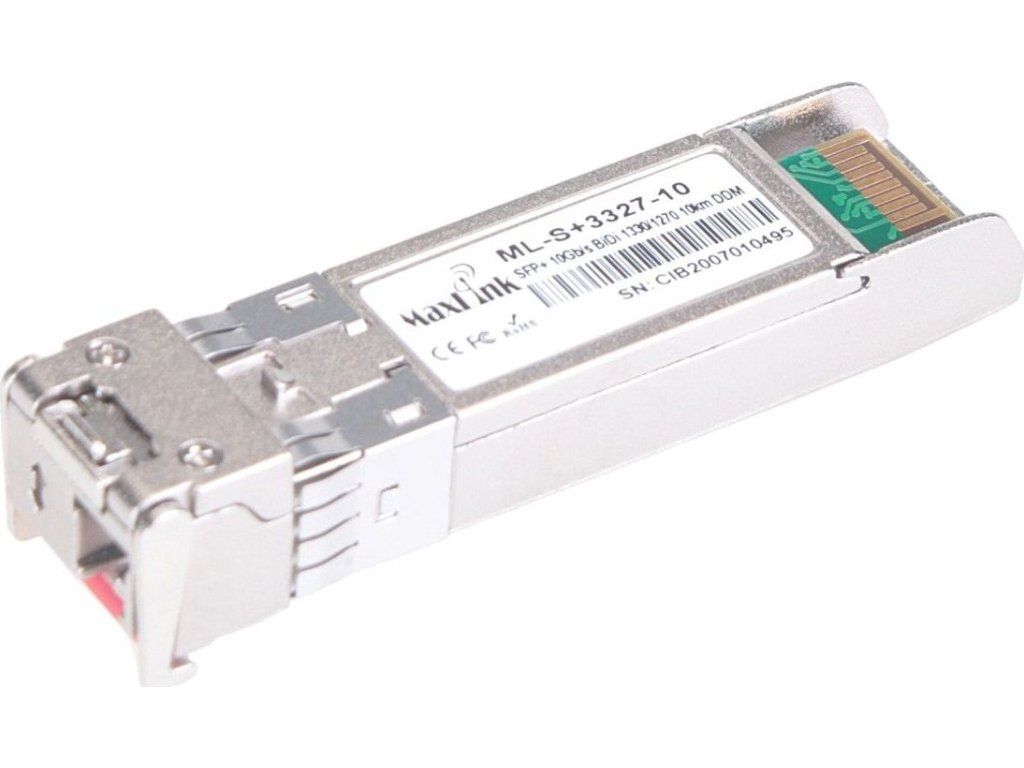 ML-S+3327-10 je singlemode 10G SFP+ WDM modul pro přenos dat pomocí jednoho vlákna s jedním LC konektorem. Vlnová délka (Tx/Rx) tohoto modulu je 1330/1270nm a je vhodný pro spojení až na vzdálenost 10km. Modul je "cisco compatibile" a je kompatibilní téměř se všemi aktivními prvky. LC konektory v SFP modulu mají broušení typu UPC.