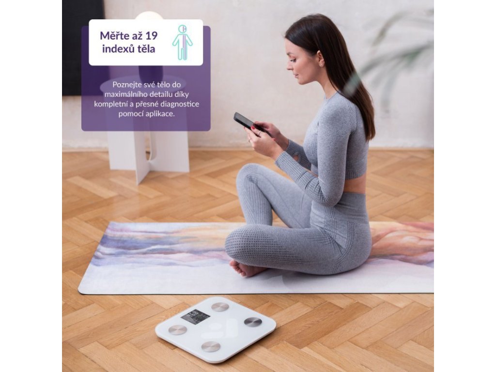 | Merané indexy | Hmotnosť, BMI (Body mass index), BFR (Blood flow restriction), BMR (Basal metabolic rate), svalová frekvencia, svalová hmota, pomer vody v tele, kostrová hmotnosť, množstvo bielkovín v tele, metabolický vek, viscerálny tuk, štandardná hmotnosť, kontrola váhy, pomer tuku v tele, hmotnosť bez tuku, úroveň obezity, telesný typ, hodnota bielkovín, skóre |