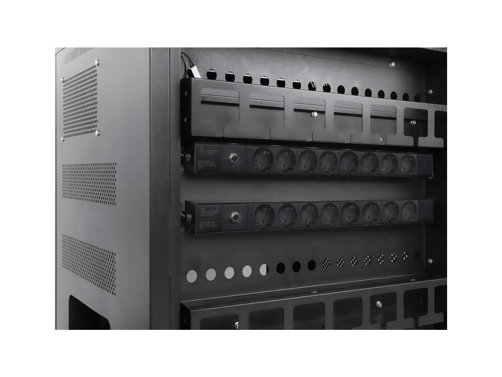 Vstavané AC zásuvky v PDU na zadnej strane jednotky uľahčujú nabíjanie zariadení, ako sú notebooky, tablety, telefóny a mnoho ďalších, pomocou ich napájacích adaptérov alebo stenných nabíjačiek. Správcovia majú pohodlný prístup cez dvierka na zadnej strane jednotky, aby sa mohli pripojiť do zásuviek a viesť káble ku zariadeniam v prednej časti.