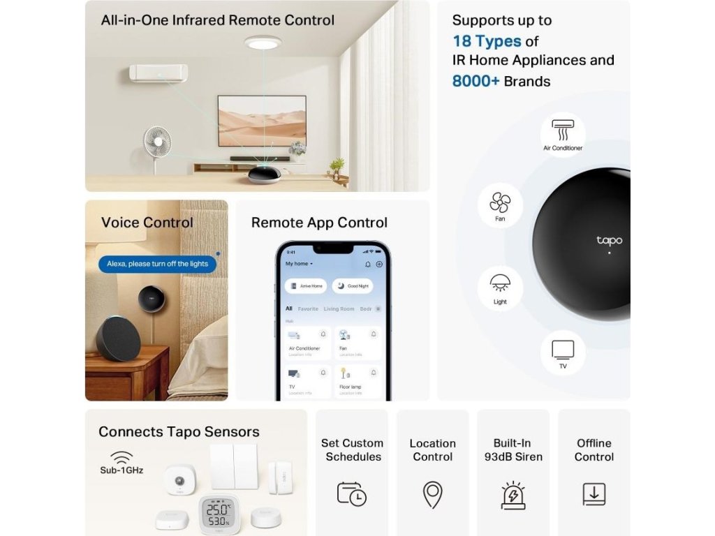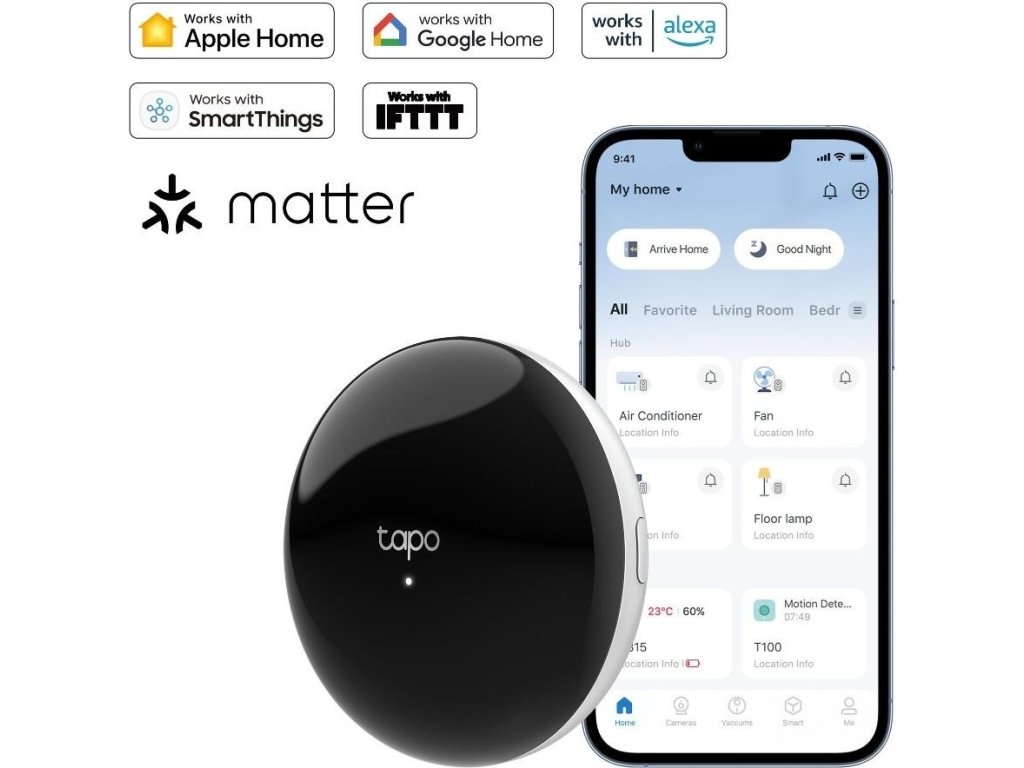 - Centrum pripojenia s certifikáciou Matter: Pripojuje a ovláda infračervené zariadenia a senzory Tapo a integruje ich do ekosystému Matter.*