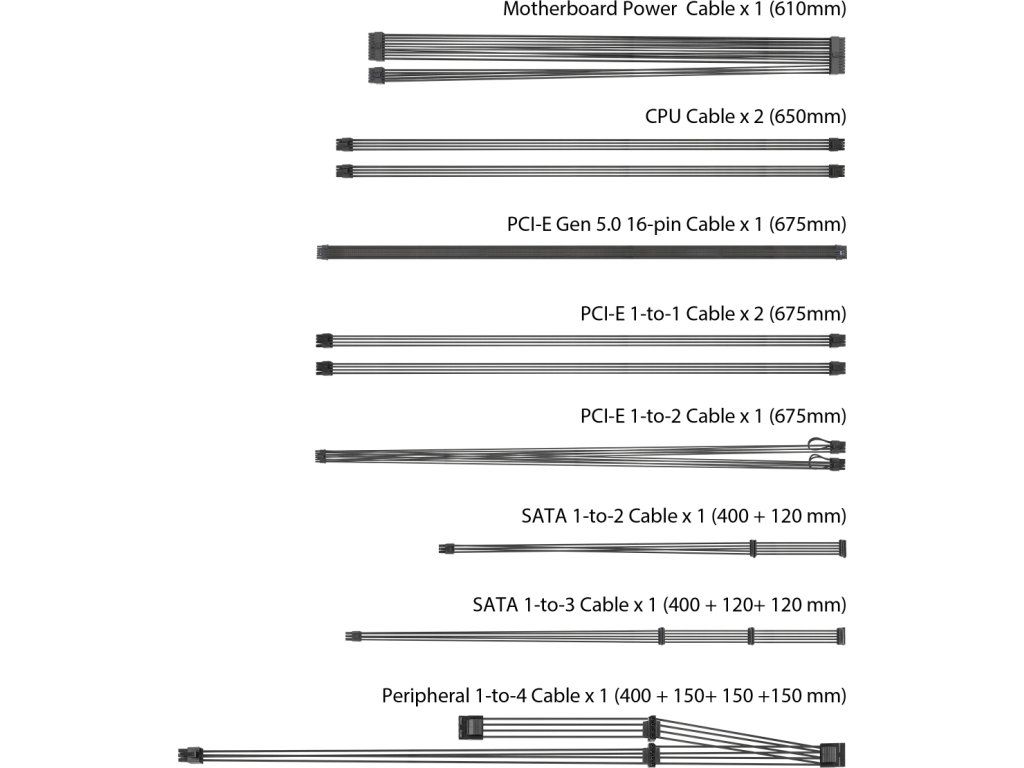 Formát zdroja:ATX; Konektory:8pin CPU 1x, 8pin CPU 2x, PCIe 6-pin, PCIe 8-pin, PCIe 16-pin Gen5, SATA 15-pin; Konektory pre základnú dosku:ATX 20-pin, ATX 24-pin, EPS 8-pin