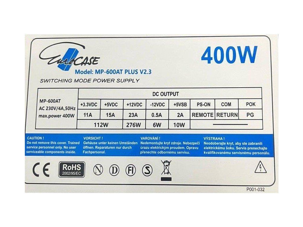 Napájací zdroj ATX značky Eurocase s výkonom 400W. Je osadený 120mm ventilátorom a pasívnym PFC (Power factor correction). Otáčky ventilátora sú riadené teplotnou reguláciou. Zdroj spĺňa požiadavky na elektrickú bezpečnosť a elektromagnetickú kompatibilitu. Zdroj vyhovuje aj smernici 2005/32/EÚ = príkon v pohotovostnom režime.