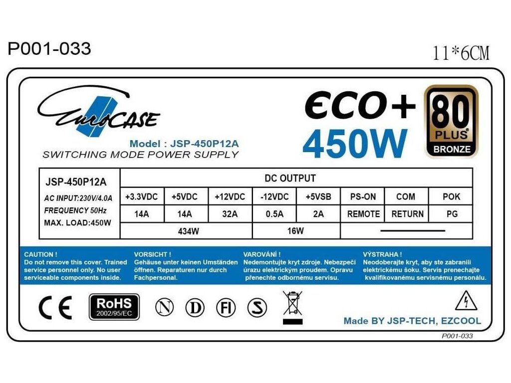 EUROCASE zdroj 450W Eco+, 120mm, 80+ Bronze, ATX