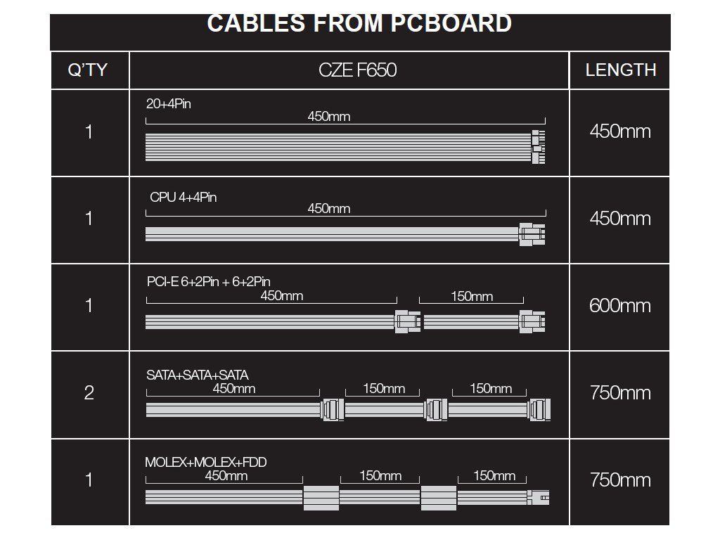 - PCI-E (6+2) +(6+2)pin (450+150 mm)