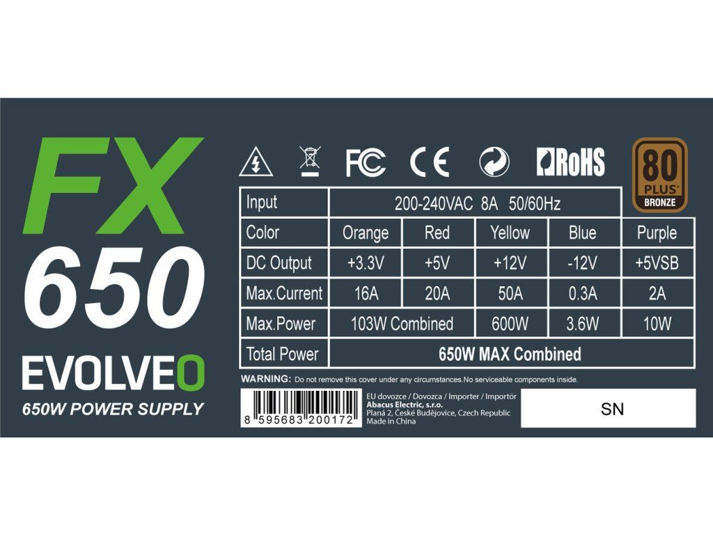 EVOLVEO FX 650 , zdroj 650W ATX, 14cm, tichý, 80+ bronze, bulk, záruka 3 roky