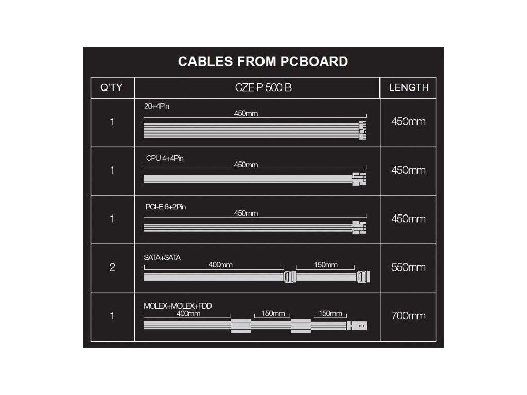 • 1x napájací kábel CPU 4pin (8pin - 4+4)• 2x napájací kábel s 2x S-ATA konektorom