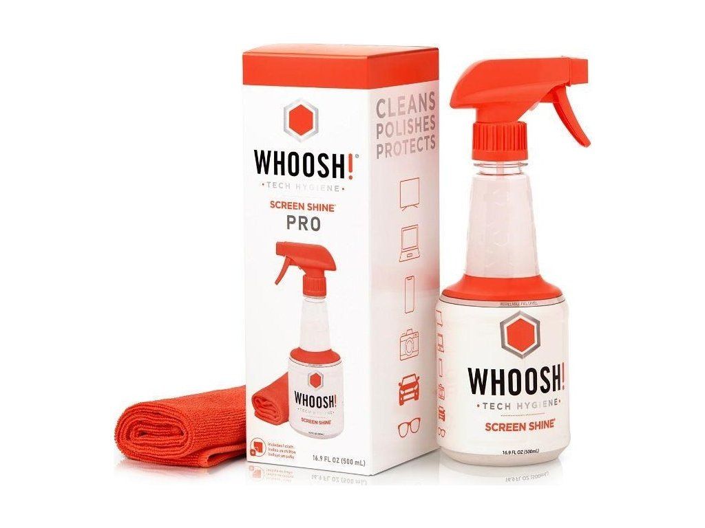 Čistiaci sprej WHOOSH! SCREEN SHINE hned po nanesení dokáže rozpustiť väčšinu olejov a biofiltrov, ktoré potom pomocou antibakteriálneho handričky z ultra tenkých mikrovlákien z povrchu úplne odstraníte. Prípravok na povrchu zároveň necháva ochranný film, díky ktorému sa na ňom ďalšie nečistoty udržia len veľmi ťažko a vaše displeje, okuliare alebo televízne obrazovky odolajú prachu, otlačkom prstov aj nechceným baktériám.