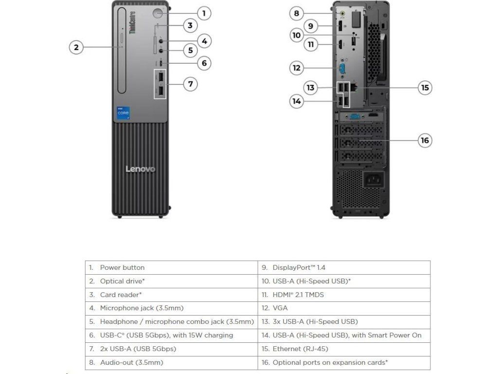 | Zadné porty | 4x USB-A (Hi-Speed USB / USB 2.0), one supports Smart Power On 1x HDMI 2.1 TMDS 1x DisplayPort™ 1.4 1x VGA 1x Ethernet (RJ-45) 1x line-out (3.5mm) |