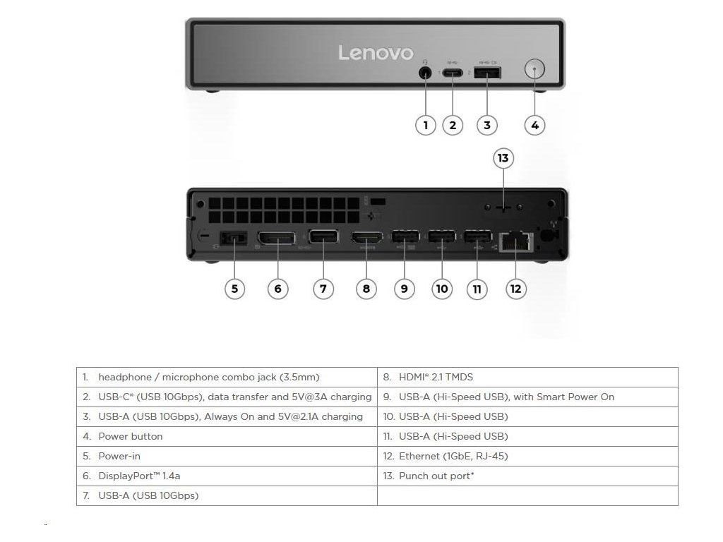 | Predné porty | 1x USB-C (USB 10Gbps / USB 3.2 Gen 2), with data transfer and 5V@3A charging 1x USB-A (USB 10Gbps / USB 3.2 Gen 2), with Always On and 5V@2.1A charging 1x headphone / microphone combo jack (3.5mm) |
